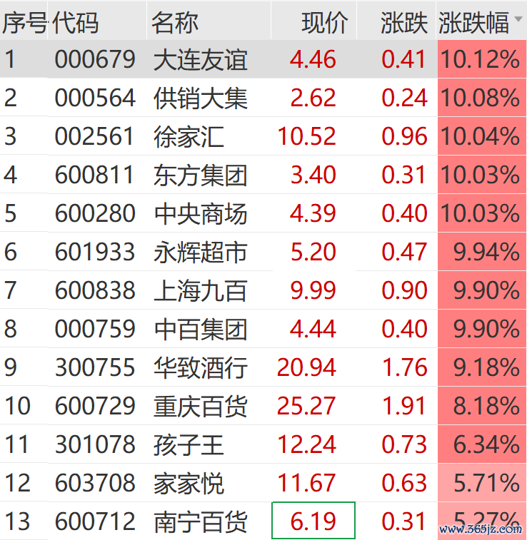 商贸零售板块走高,大连友谊、供销大集、东方集团、中央超市、永辉超市等多股涨停。