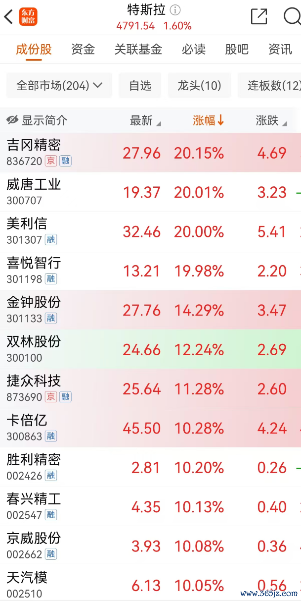 马斯克成功“押注”之际,昨夜美股特斯拉股价大涨。11月7日上午,A股特斯拉概念股同样火热,威唐工业、美利信、喜悦智能等走出20CM涨停,胜利精密、春兴精工、天汽模等多股涨停。