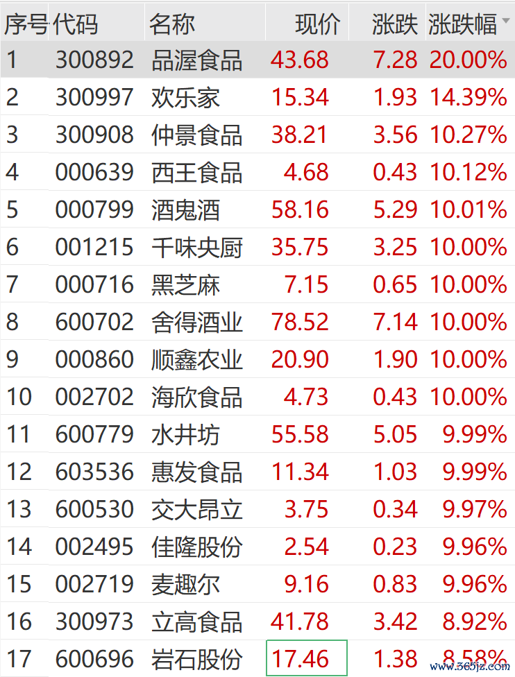 大消费盘中发力,食品饮料板块盘中走高。品渥食品20CM涨停,黑芝麻5连板,千味央厨、惠发食品、麦趣尔等多股涨停。白酒股集体回暖,酒鬼酒、顺鑫农业、水井坊、舍得酒业等陆续涨停,皇台酒业、金种子酒等跟涨。